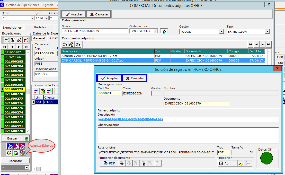 Las tablas que permite adjuntar diversos ficheros son: proveedores, clientes, personal, cargas, partidas y expediciones. En la siguiente imagen se muestra una expedición en la que se han asociado dos ficheros adjuntos.