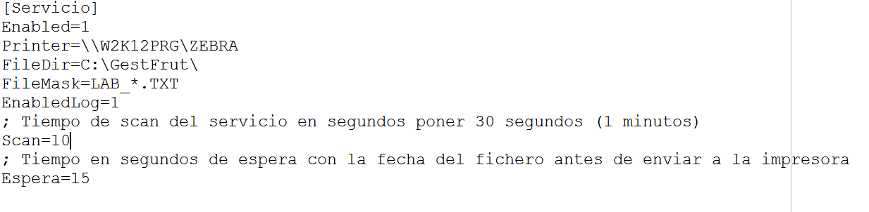 Para configurar el servicio se debe editar el fichero CLOUD2PRN.INI situado en la carpeta C:\GESTFRUT\CLOUD2PRN.