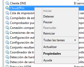 Si se hace cualquier cambio en el fichero de configuración es necesario detener e iniciar de nuevo el servicio, usando el botón derecho sobre el servicio.