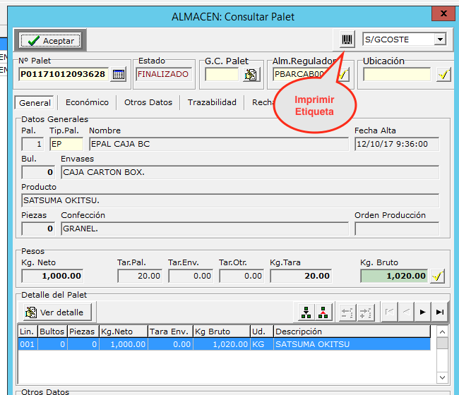 Al pulsar el botón de etiqueta se imprime la etiqueta con el formato seleccionado, esta impresión se realiza en dos pasos: