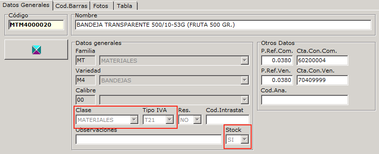 Los materiales se dan de alta en la opción Artículo/Artículo. Tambien es conveniente crear una o varias familias de materiales y crear a nivel de la variedad varias subfamilias (bandejas, cajas, etc). En la ficha hay que marcar la clase como MATERIALES, el tipo de IVA (T21/THI) y el campo STOCK=SI para indicar que se desea llevar el control del stock. También se puede indicar el precio de compra y la cuenta contable para su enlace con la contabilidad.