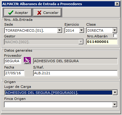 El stock de materiales se incrementa usando la opción Almacén/Materiales/Entrada Almacén, desde aquí se registra el albarán de compra con los datos del proveedor: