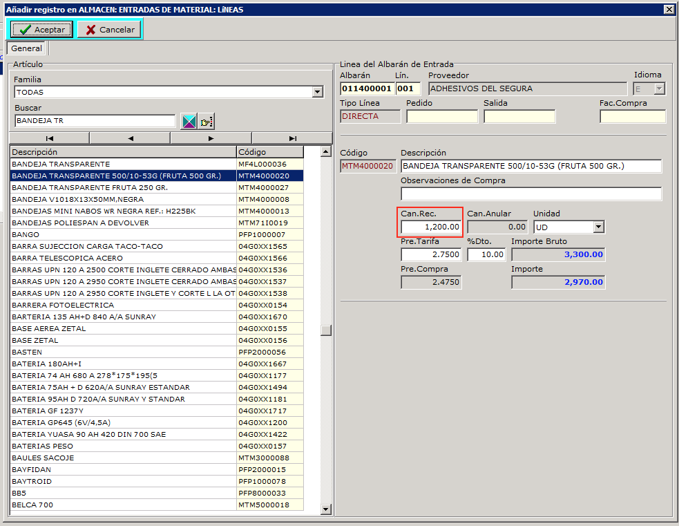 A continuación en las líneas se indica los materiales y las cantidades que están entrando en el almacén.
