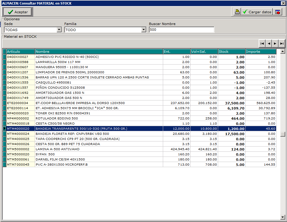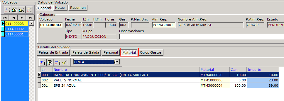 RECUERDE: El stock de materiales se incrementa con los albaranes de compra de materiales y se decrementa con los materiales registrados en el volcado.