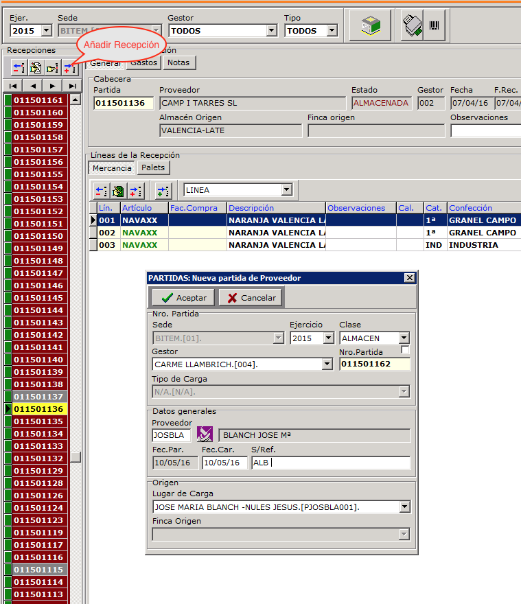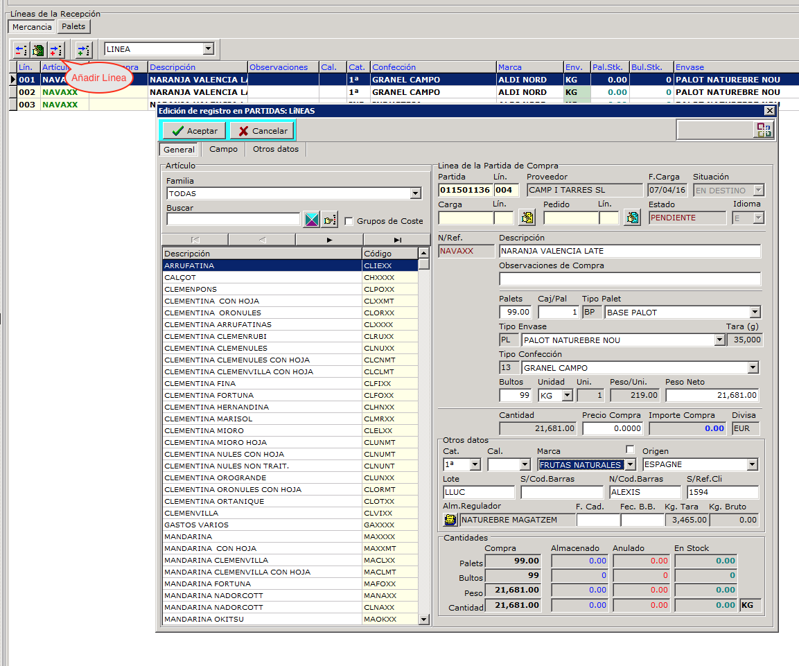 A continuación usamos el botón añadir líneas a la recepción para agregar líneas, en cada línea podremos registrar toda información necesaria: número de palets, producto, envase, confección, categoría, calibre, marca, precio, etc.
