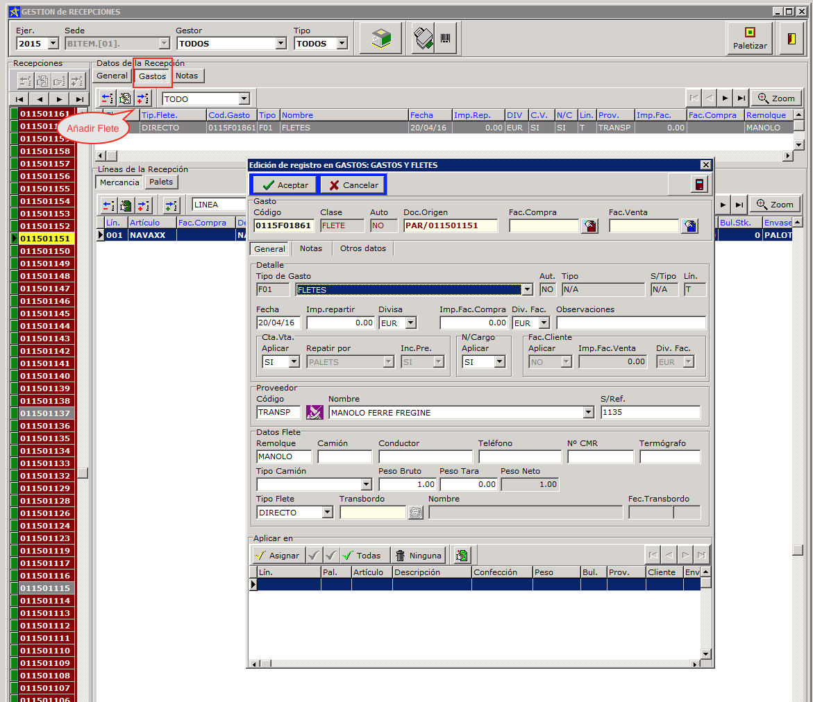 Añadir flete a la recepción.