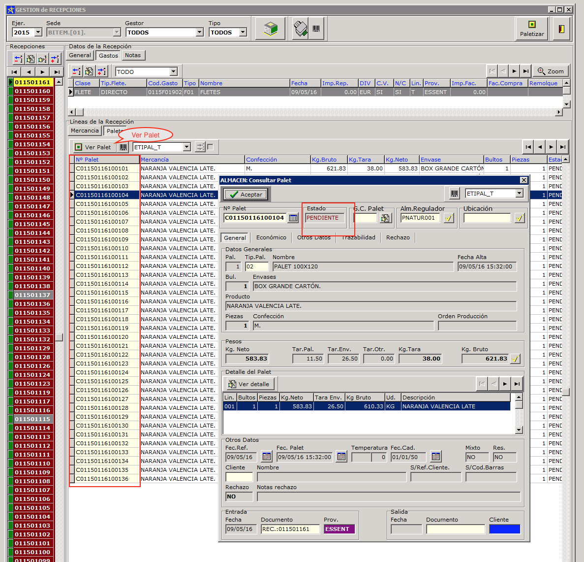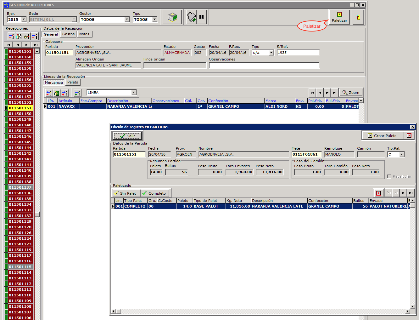 Finalmente se usa el botón paletizar para crear los palets correspondientes a la recepción, podemos elegir crear palets tipo C o A y si deseamos recalcular los pesos para tener en cuenta la tara del camión. Al pulsar el botón Crear Palets se crearán los palets indicados en la recepción.
