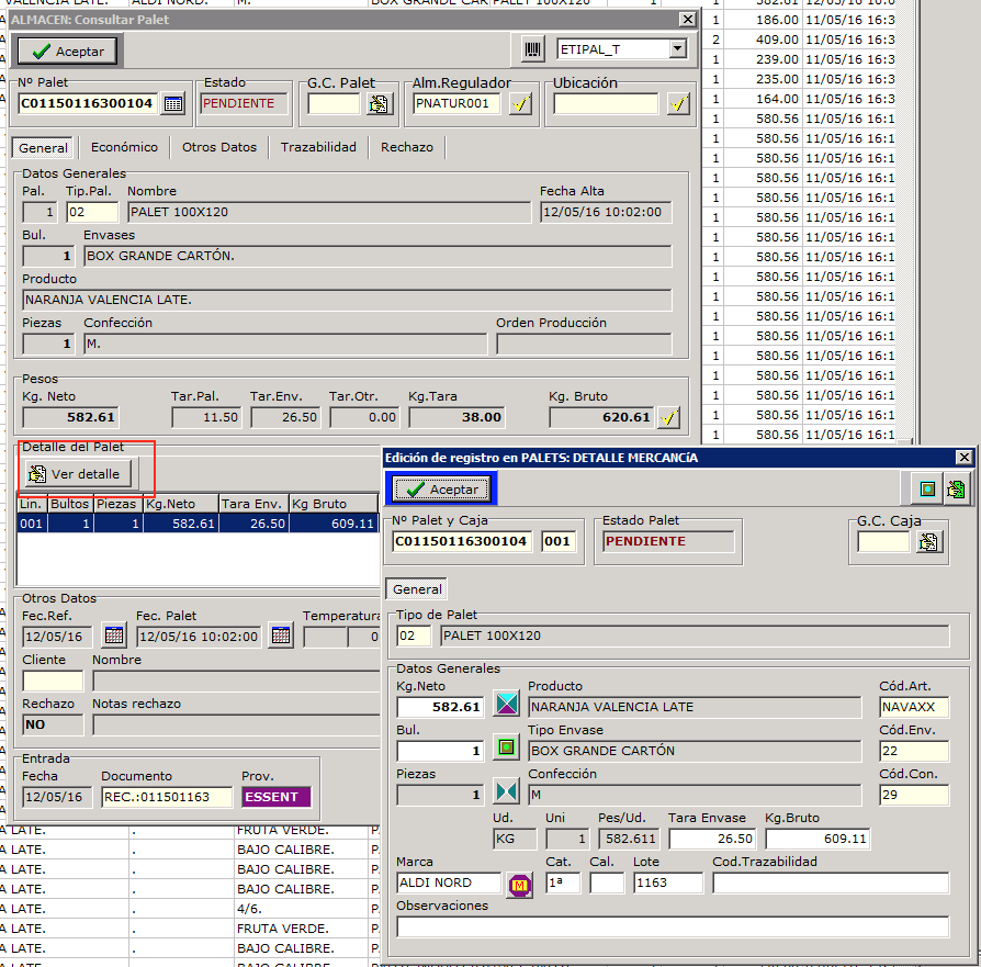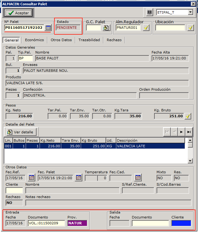 El palet registra todos los datos asociados : pesos, taras, productos, fecha de creación, caducidad, etc. Además registra cuando se produjo la entrada y la salida.