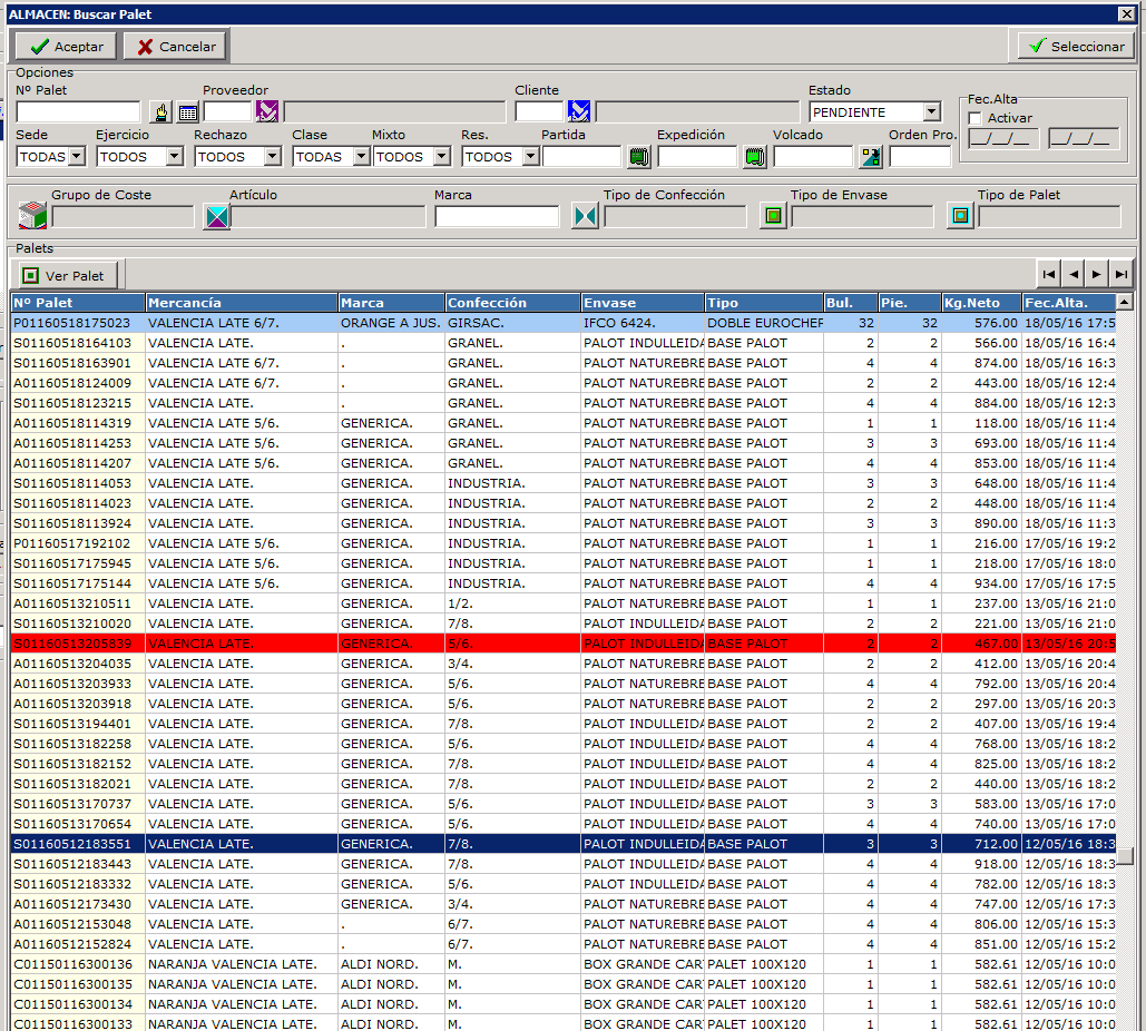 Con la consulta de buscar palets se puede acceder a todos los palets que han pasado por el sistema, estén pendientes o no. El sistema permite gestionar palets reservados por clientes, palets rechazados y palets mixtos.