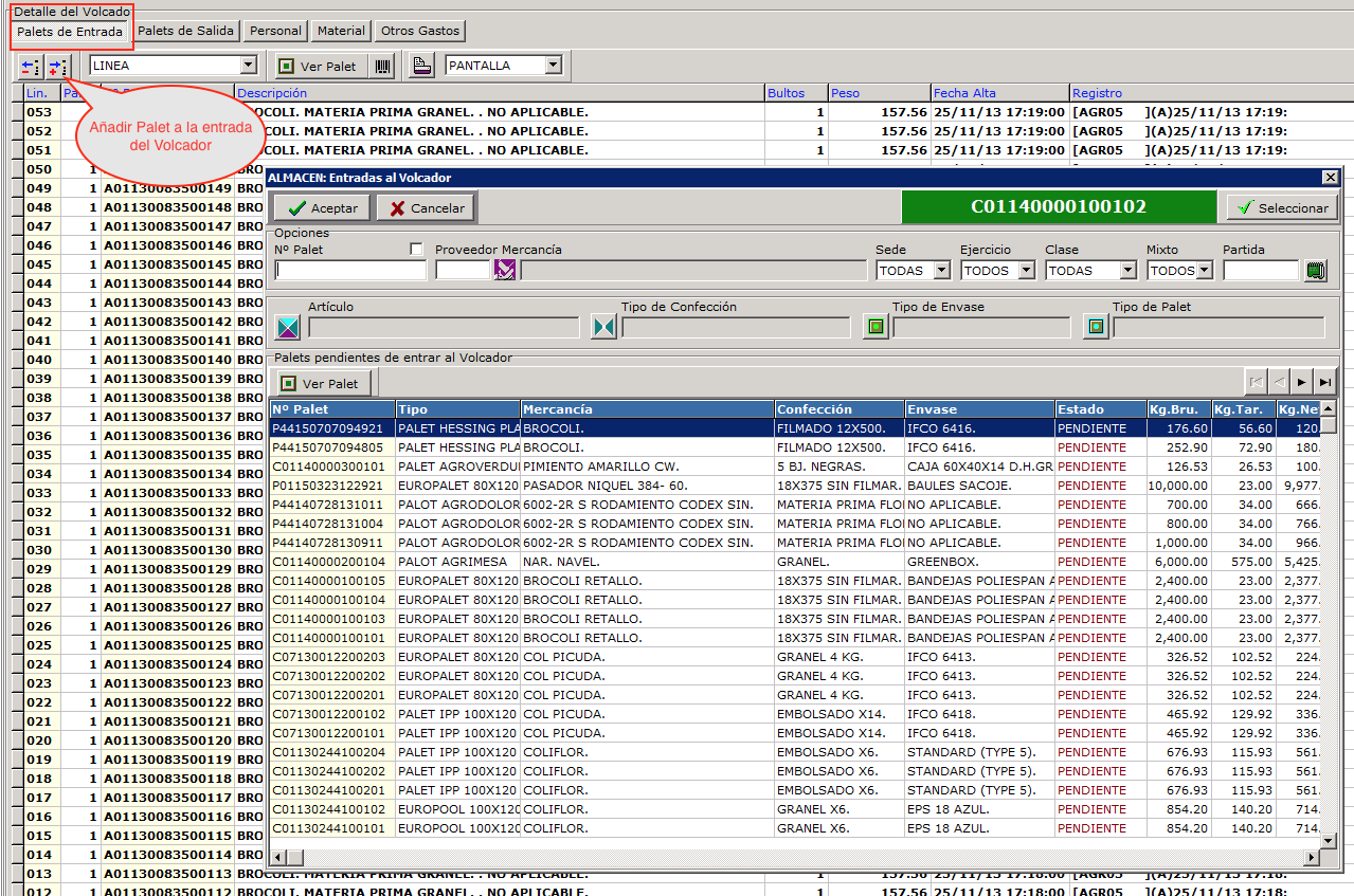 A continuación debemos indicar cuales son los palets que entramos al volcador, es decir los palets que gastamos, estos palets estarán PENDIENTES y normalmente serán de campo (C) o de subproducto (S). Los palets se pueden ir cargando seleccionado con una lista o usando un lector de código de barras.