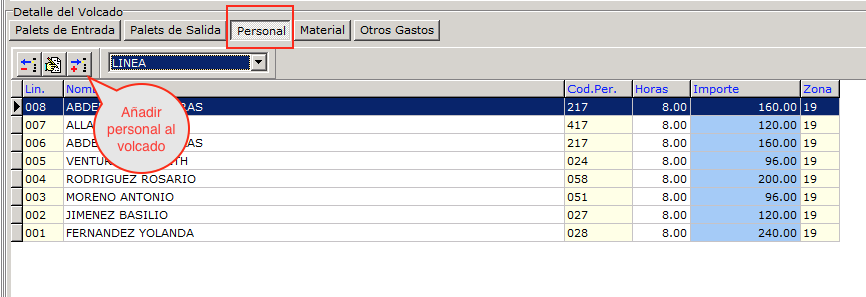 En la pestaña personal se debe indicar el personal que ha intervenido en el volcado y lo que represente sus gastos. Se puede registrar la lista detallada de cada trabajador o se puede registrar un gasto por todos ellos.