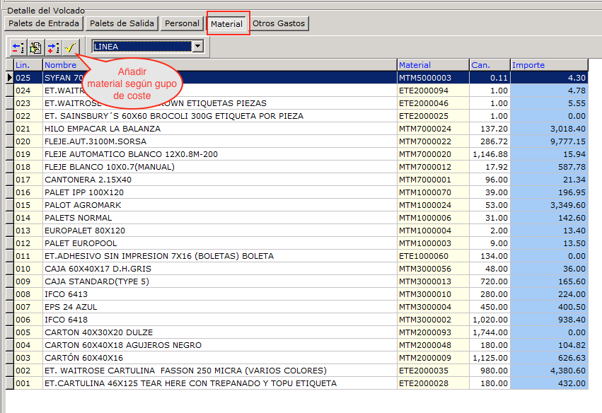 En el proceso de volcado interviene el personal de almacén y se gastan ciertos materiales de embalaje (cajas, cantoneras, flejes, etc). Es posible registrar todos estos costes para saber los costes de producción de cada palet producido.