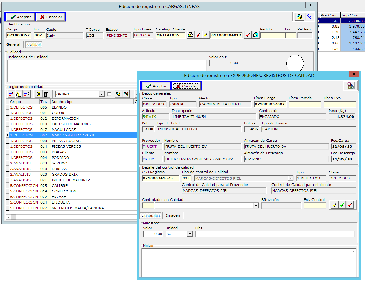 Si se dispone del módulo opcional de control de calidad se puede realizar un control de calidad en origen (CARGAS) y un control de calidad en destino (EXPEDICIONES).