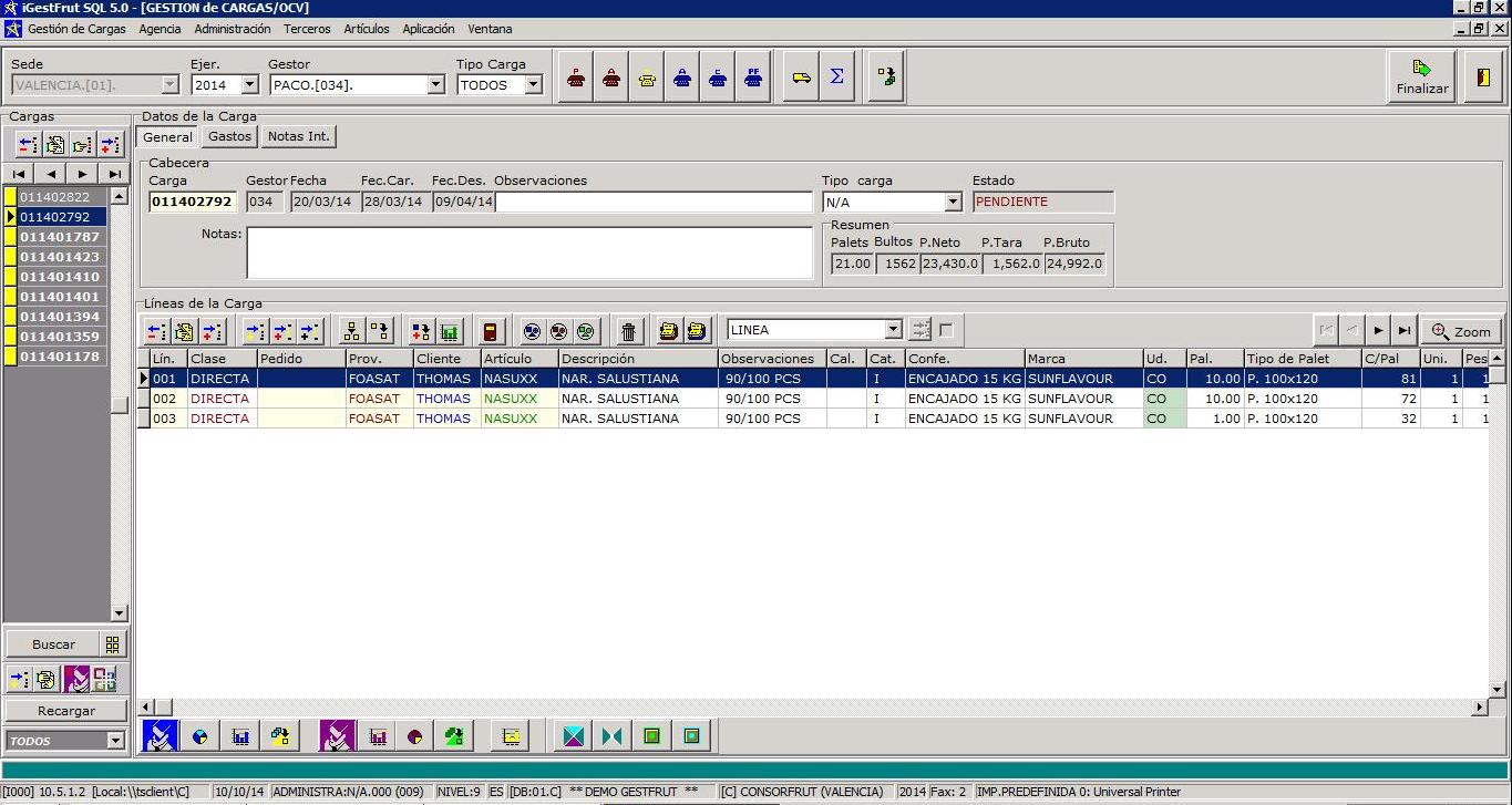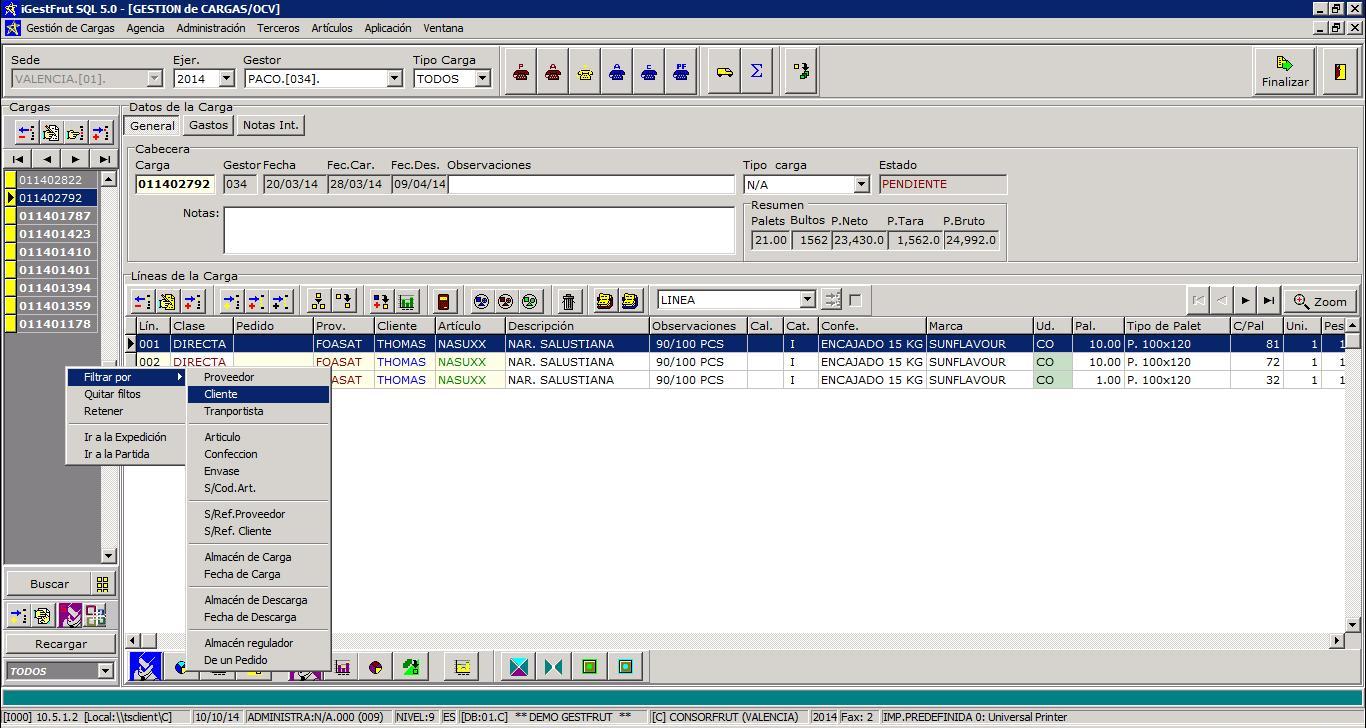 Además, situando el ratón en la lista de cargas y pulsando el botón derecho se pueden filtrar las cargas por cliente, proveedor, articulo, envase etc.