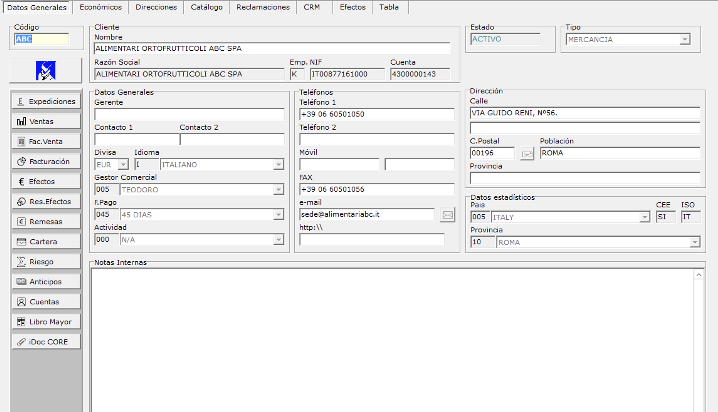 En la opción Terceros/Clientes se dan de alta las fichas de los clientes. La información se organiza por pestañas: