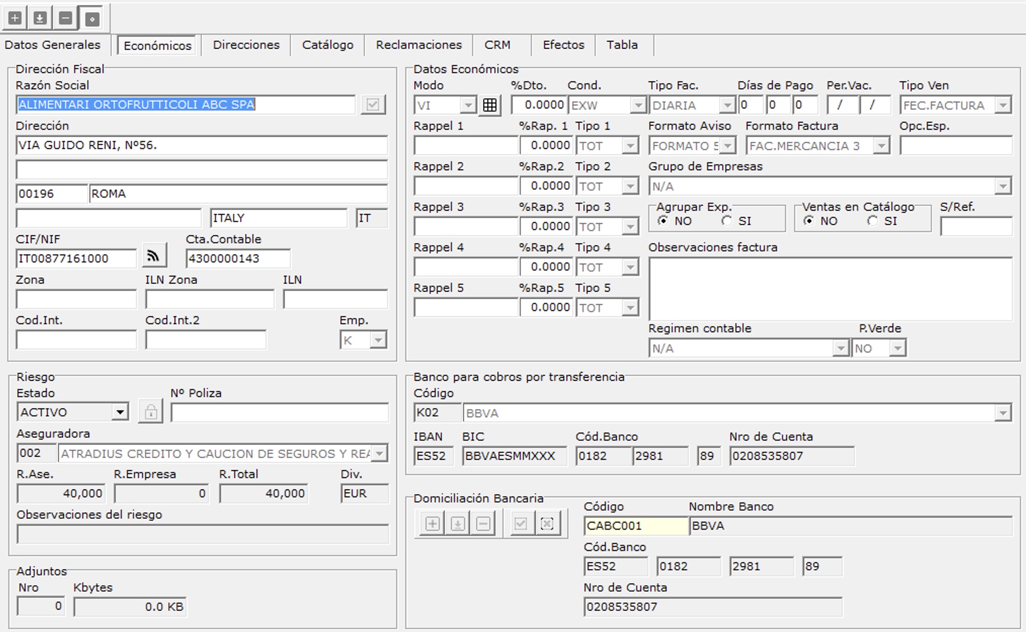 Destacar la cuenta contable , el modo de venta (ver enlace), el descuento y los rappels (ver enlace), el tipo de vencimiento que se combina con la forma de pago, el banco que se imprimirá en las facturas y el control del riesgo.