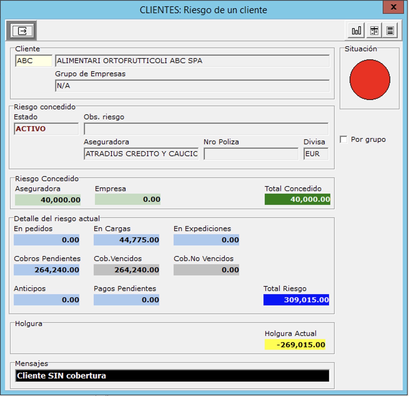 El riesgo se puede configurar para que avise o bloquee una operación cuando se excede el riesgo. Para poder manipular el riesgo hace se puede configurar una clave de acceso que se encuentra en Administración/Auxiliares/Empresas/Opciones. La pantalla de control de riesgo tiene este aspecto.