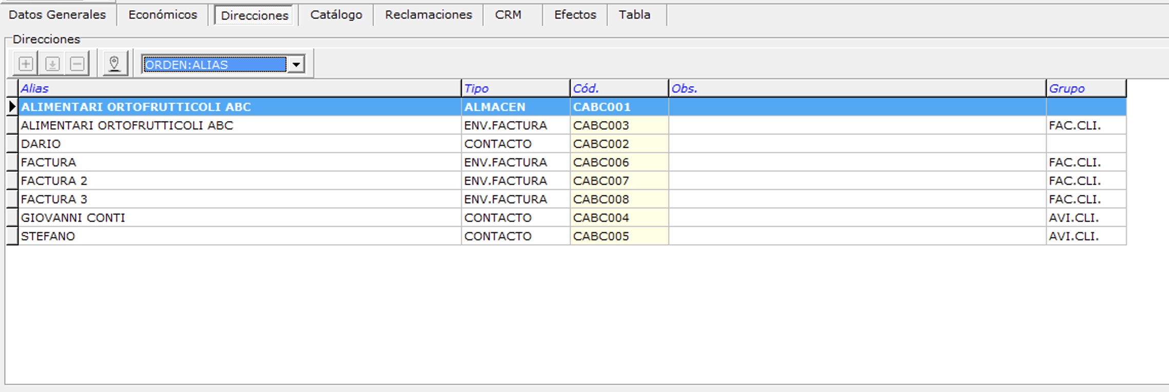 En la pestaña direcciones se deben indicar todos los almacenes de descarga del cliente así como sus contactos, esto permitirá seleccionarlos cuando se envía un mail usando ActiveFax.