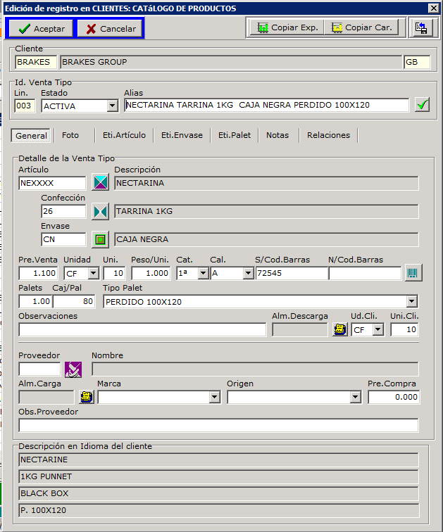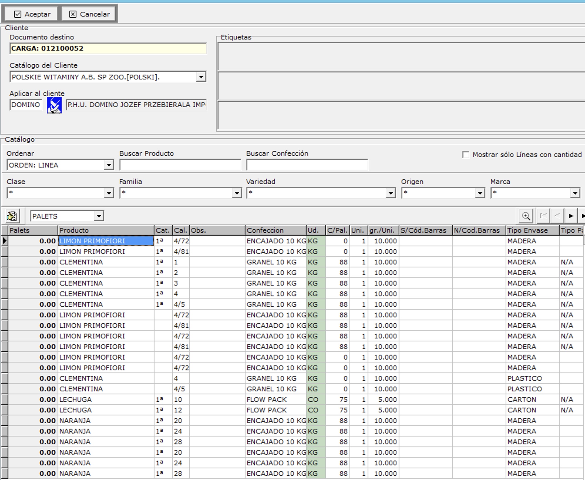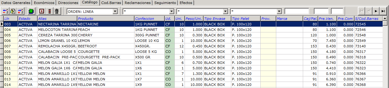 Las líneas de catálogo disponen de todos los campos que se requiere al hace una carga: producto, confección, envase, palets, marca, etc.. Se puede usar el campo estado para activar/desactivar los productos de temporada.