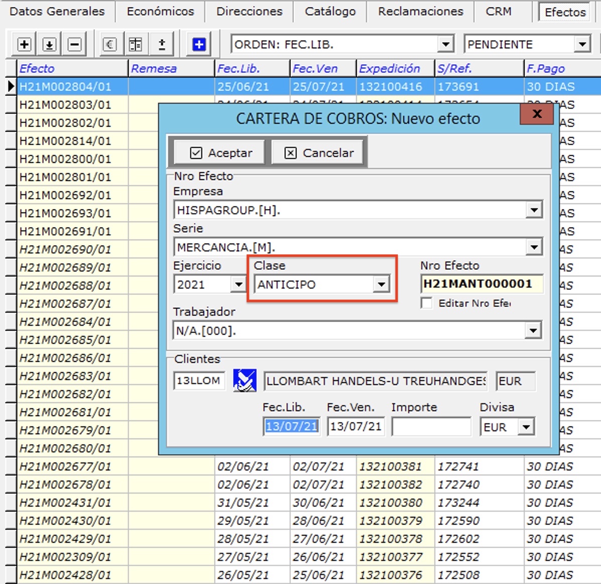 Para registrar un anticipo se hace desde la ficha de clientes (Terceros/Clientes) para anticipos de cobros o desde la ficha de proveedores (Terceros/proveedores) para anticipos de pagos. En la pestaña de efectos se usa el botón añadir efecto y seleccionamos clase ANTICIPO.