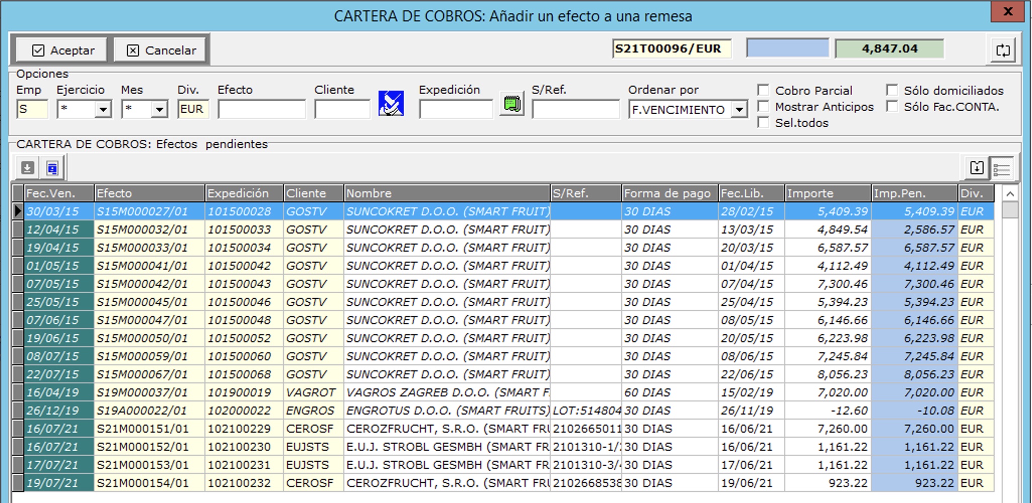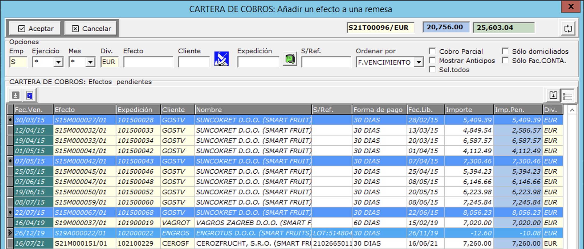 Finalmente , cuando se desea compensar el anticipo con una o varias facturas del cliente/proveedor se creará una nueva remesa de cobros/pagos, en ella se activará la opción de mostrar anticipos y se deberá de seleccionar simultáneamente (con control + click) un anticipo y los efectos a compensar. En la imagen siguiente se va a compensar un anticipo con dos facturas pendientes.