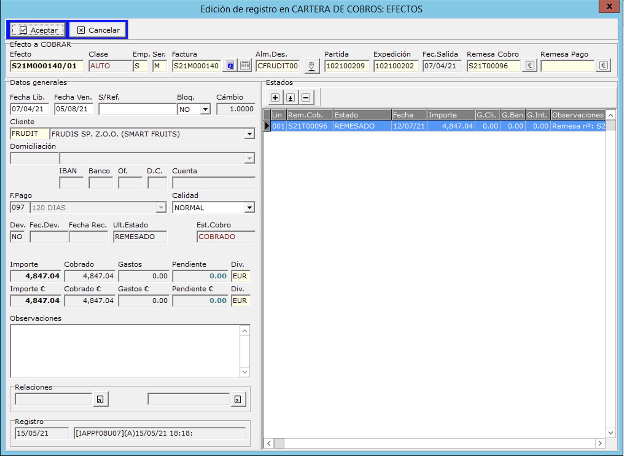 Una vez registrado el anticipo se deve crear una remesa para hacer el enlace contable correspondiente al ingreso del anticipo. Estas remesas se hacen desde Administración/Cobros o Pagos/Remesas/Mantenimiento. Al añadir efectos, se selecciona la opción mostrar anticipos y se debe seleccionar sólo uno o varios anticipos, se preguntará si es una remesa para ingresos de anticipos, se debe contestar que si.