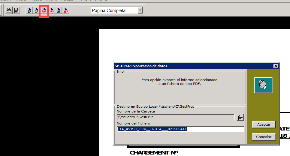 Si se está usando la aplicación desde la nube, el envío de faxes no es posible hacerlo directamente. Para ello se debe usar el botón Visualizar , y desde la vista previa usar el botón exportar a PDF, esto creará un archivo en nuestra carpeta local que podremos enviar desde nuestro correo electrónico local.