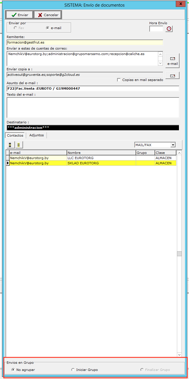 Sí, Es posible agrupar cualquier tipo de envió para juntar documentos de distinto tipo, por ejemplo en un sólo mail se pueden enviar varias cuentas de venta y varios pedidos juntos.