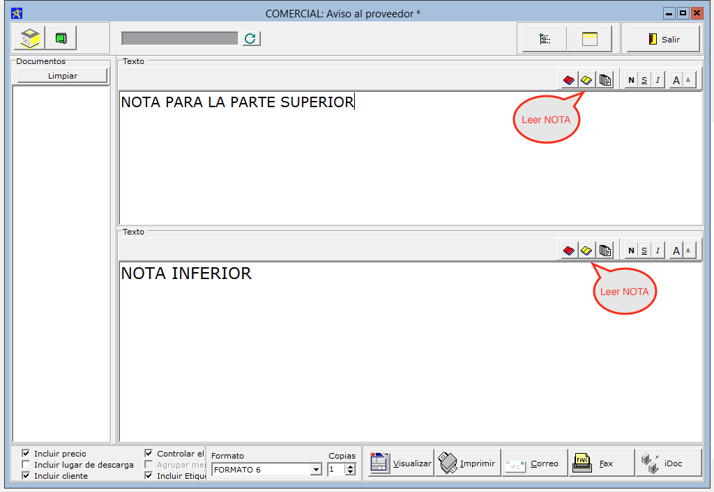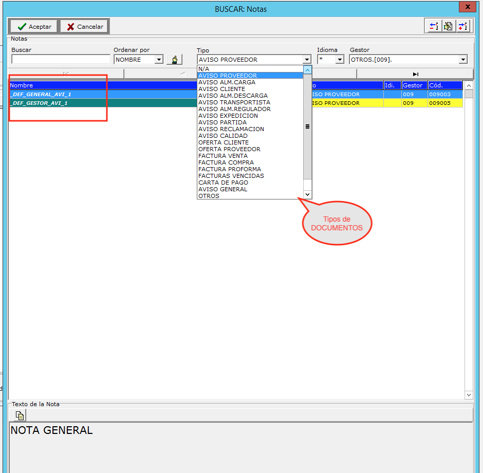 Es posible hacer que en cada tipo de documento (AVISO AL PROVEEDOR, AVISO AL CLIENTE, FACTURA,etc..) se cargue de forma predeterminada una nota con el texto que hayamos definido.