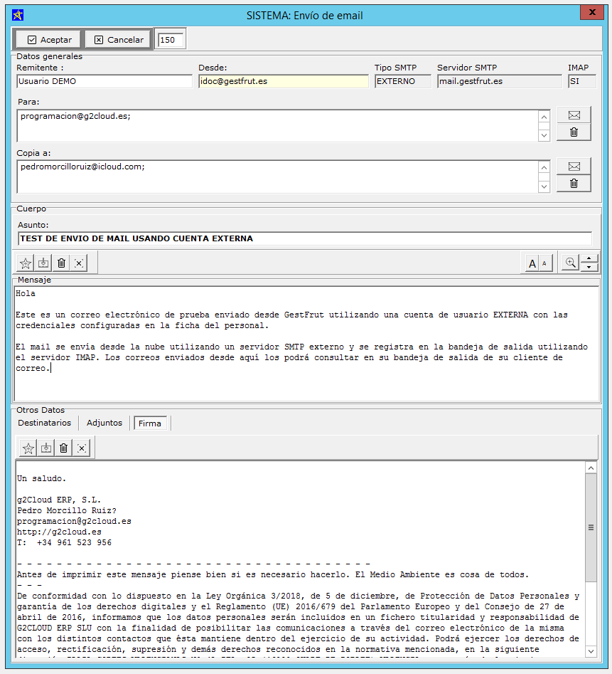 Es posible configurar para cada usuario el sistema de envío preferido. La pantalla de envio permite configurar una firma, enviar en copia y adjuntar documentos. Los correos se envian en formato de texto plano.