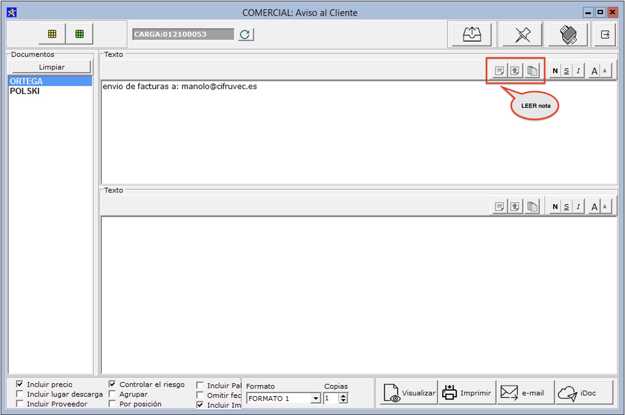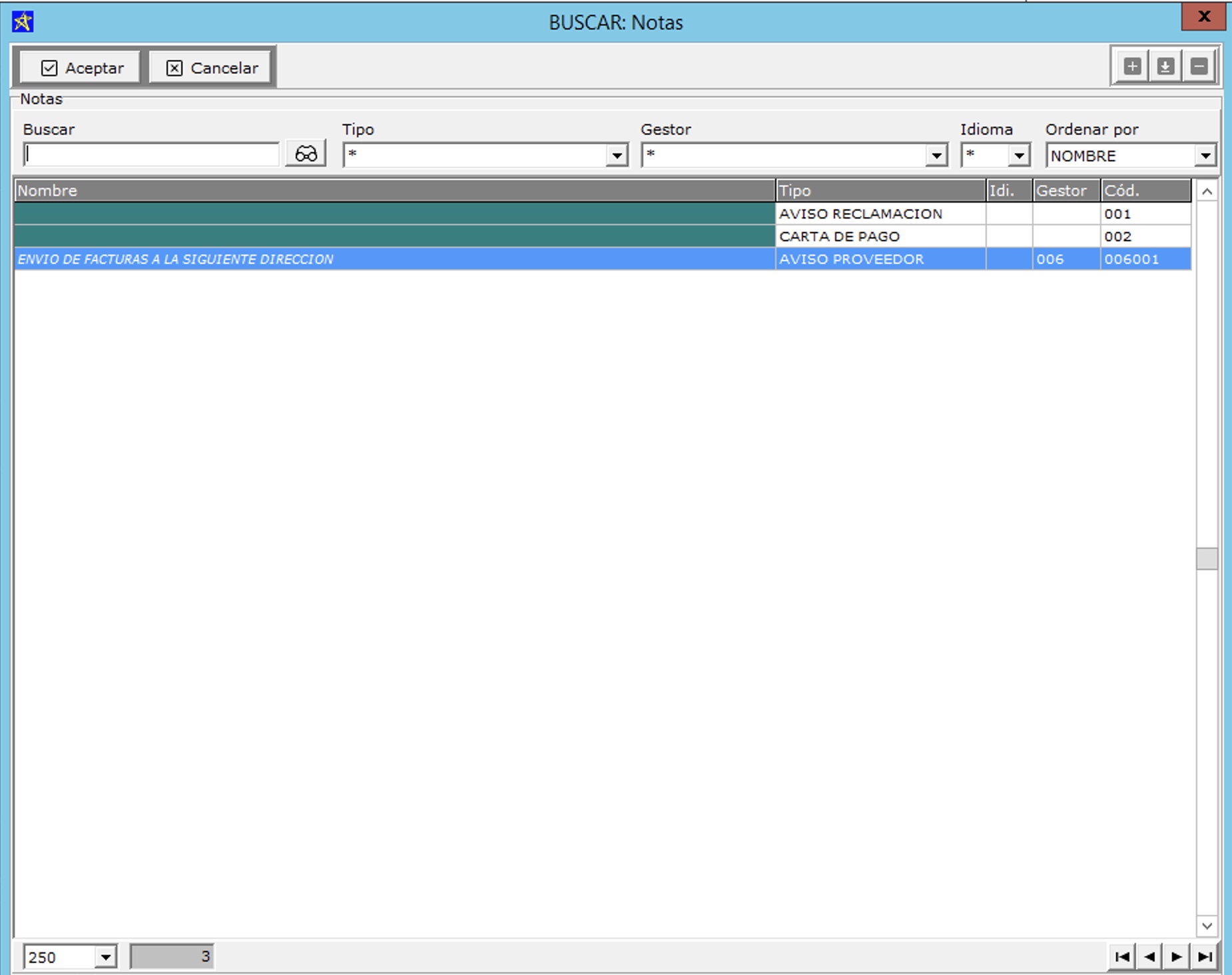 Los documentos (Avisos, Facturas, etc) que se intercambia con los proveedores y clientes disponen de unos campos para notas. Una de las notas se sitúa en la parte superior del documento y otras para la parte inferior. Estas notas se agregan al documento que se envía, pero no se guardan en el propio documento. Son útiles para informar de datos o instrucciones complementarias que deseamos aparezcan en el documento.