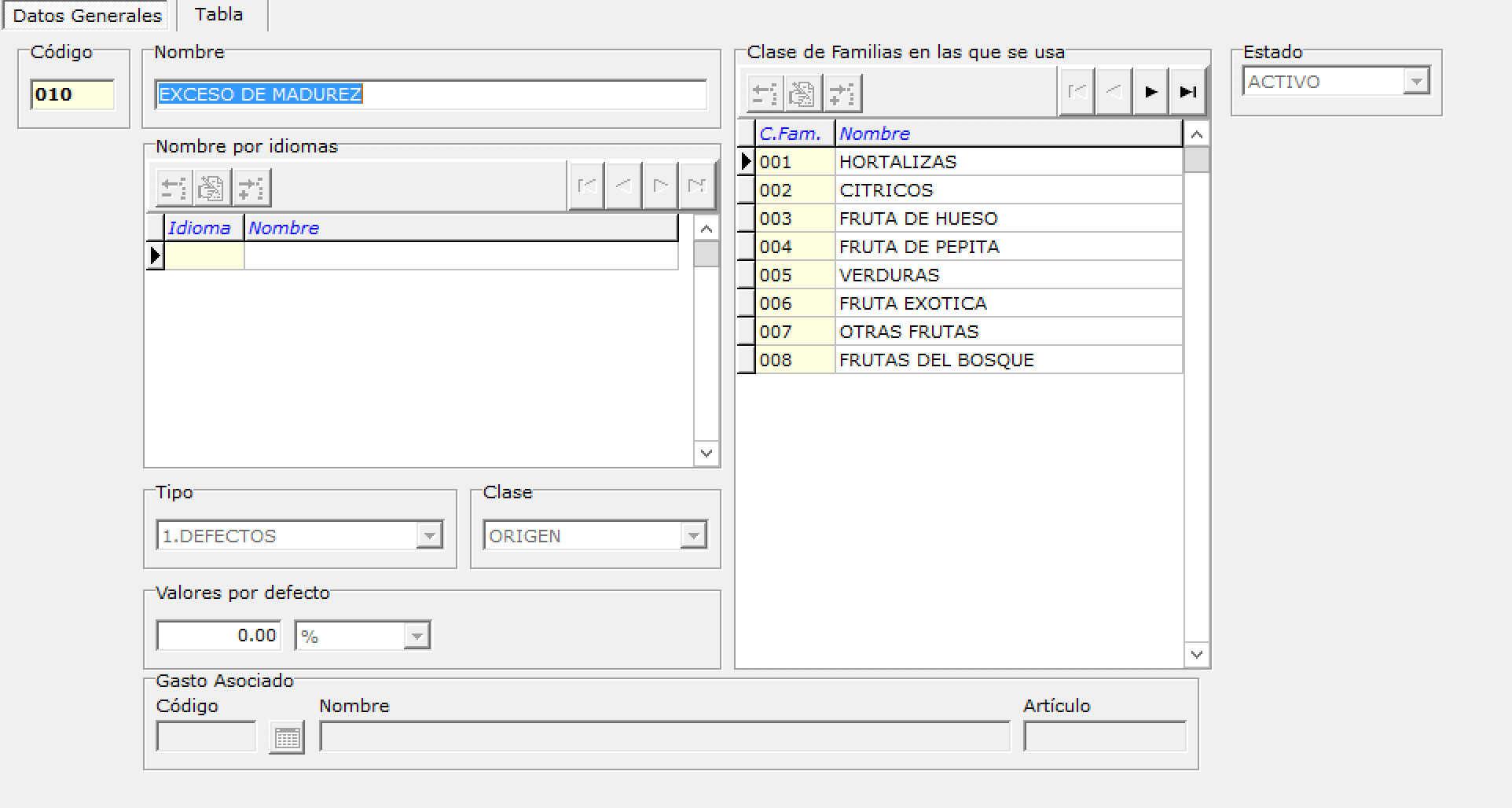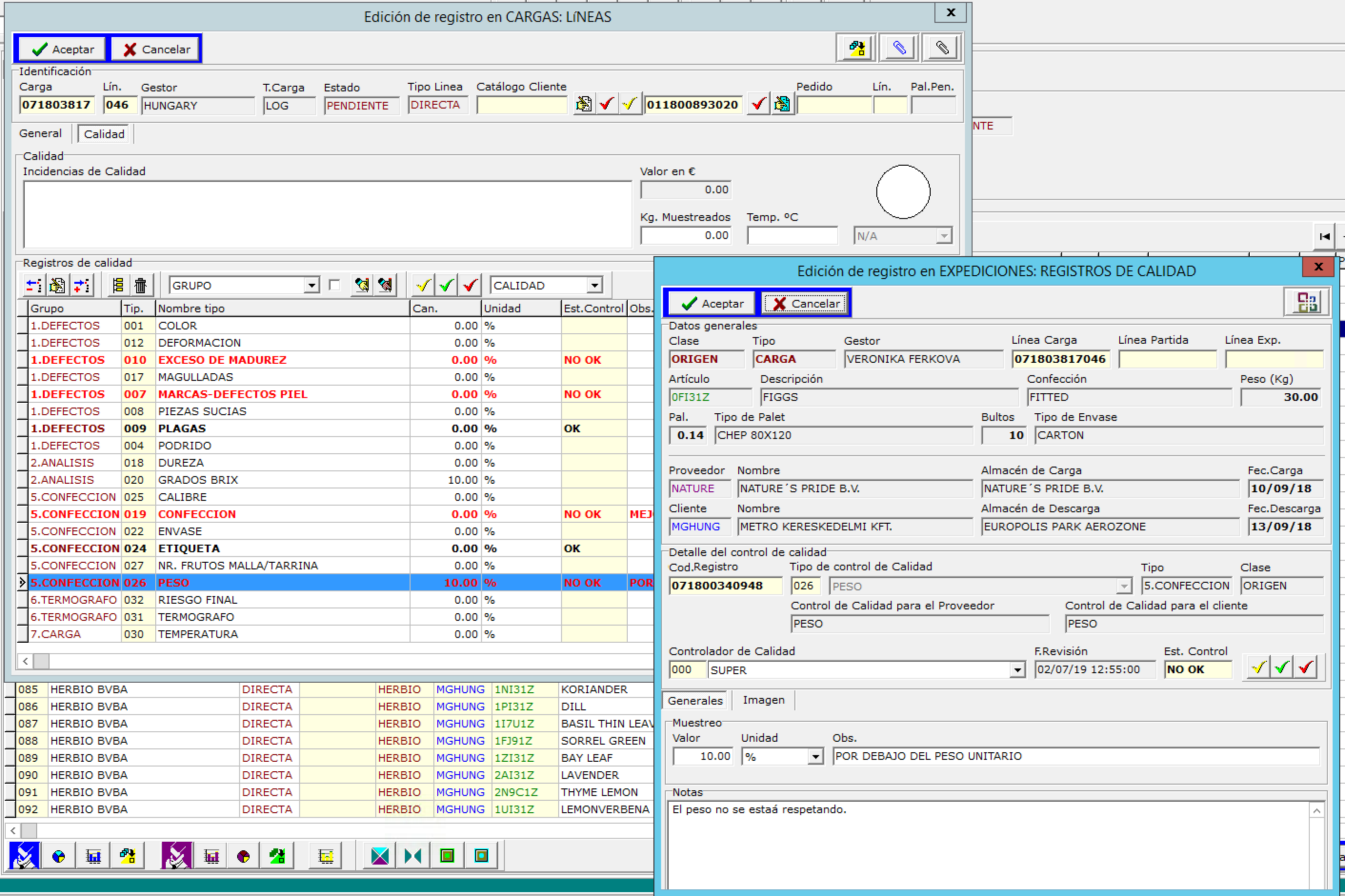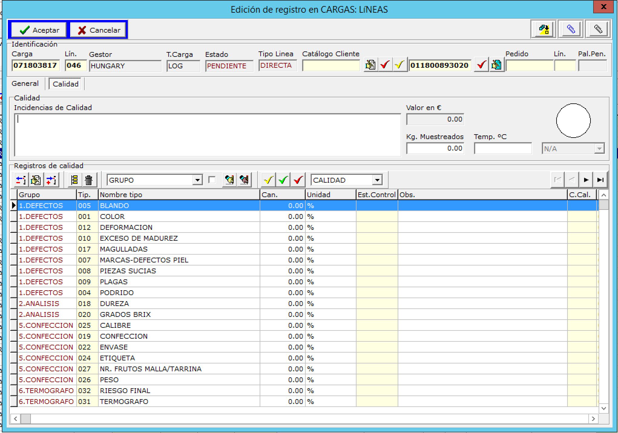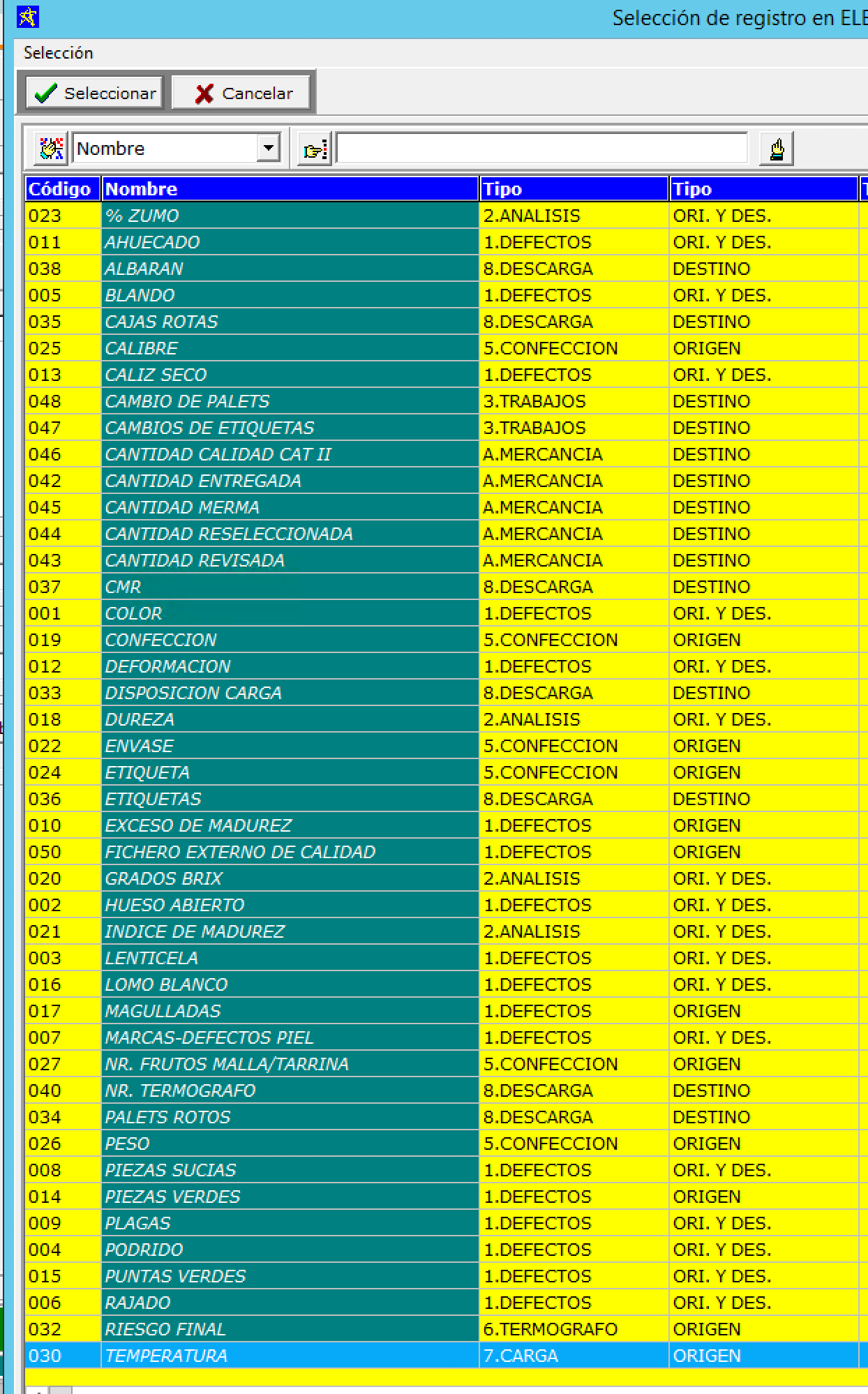 Los elementos de calidad que se desean tener disponibles se crean desde Agencia/Auxliares/Tipos de Registro de Calidad. Cada elemento se puede clasificar para control de calidad en origen o en destino.
