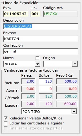 En el grupo Cantidades a Facturar/Liquidar se muestran las cantidades, recuerde que siempre se indican de forma simultánea por palets, bultos y kilos.