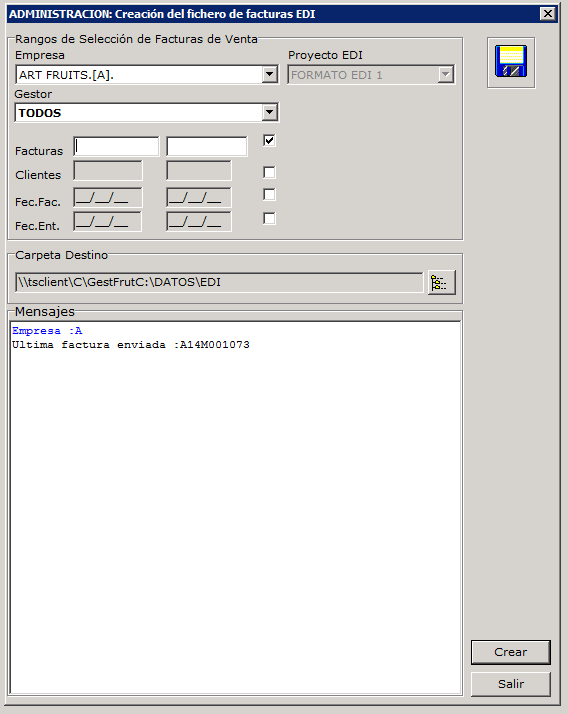 Si tienes instalado este módulo podrá acceder a él en Administración/Facturas de Venta /Exportar, podrá seleccionar un bloque de facturas por clientes, fecha o número. El sistema creará un archivo EDI de acuerdo con las especificaciones del cliente.
