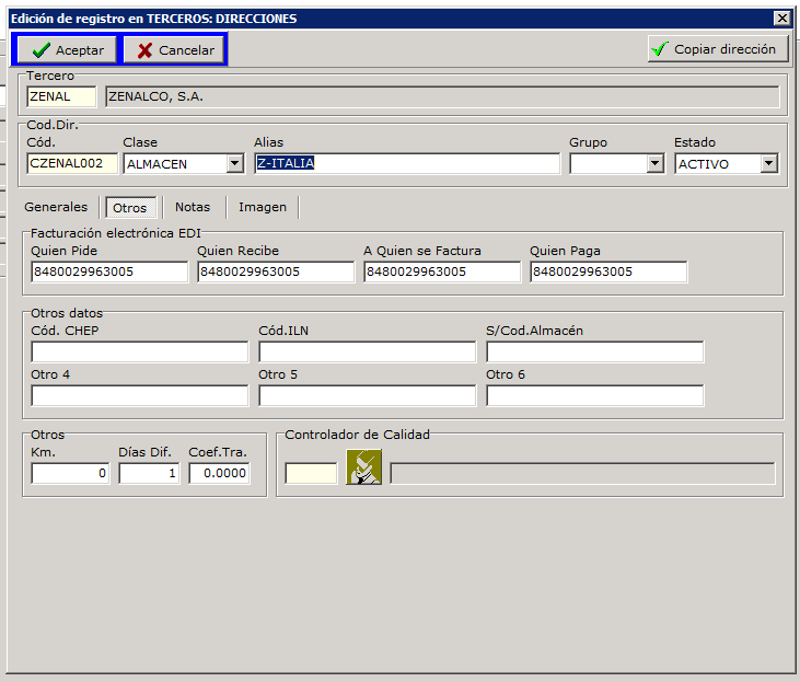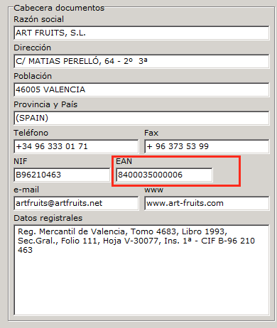 - 1.- Código EAN propio: Es nuestro código EAN , se registra en Administracion/Auxiliares/Empresas, si no disponemos de él se debe teclear el NIF.