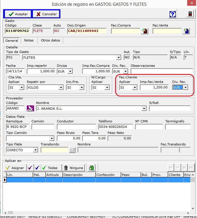 También es posible facturar este gasto desde mantenimiento de facturas, en una factura aparte de fletes/gastos o incluirlo en una factura de mercancía.