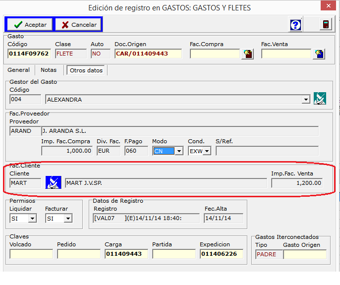 En ocasiones un flete o gasto se puede facturar a un cliente, para ello en el gasto se debe indicar los datos que se muestran: