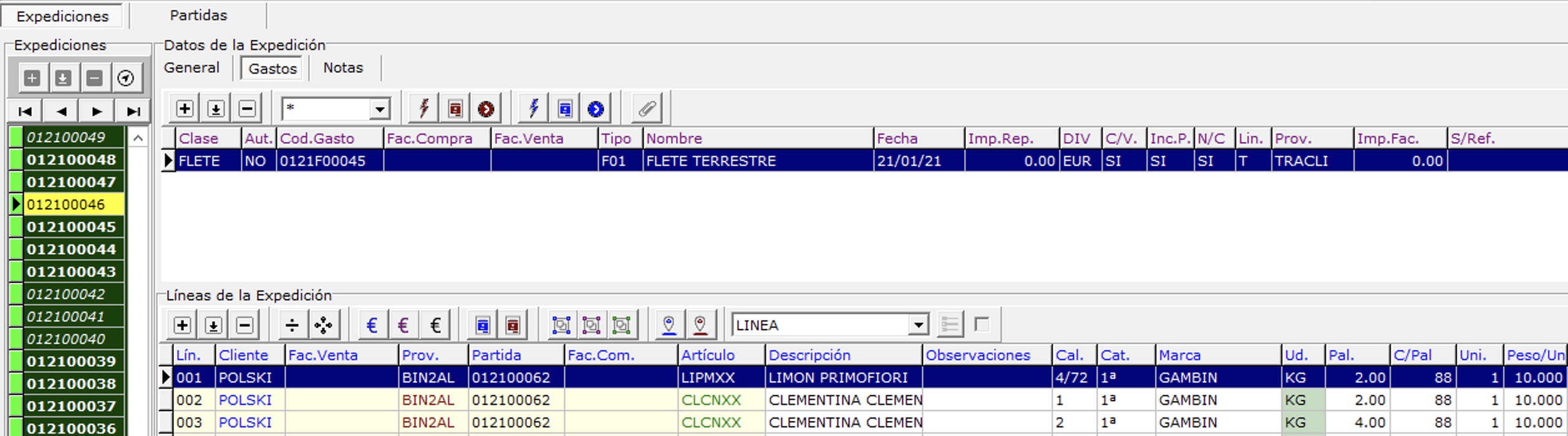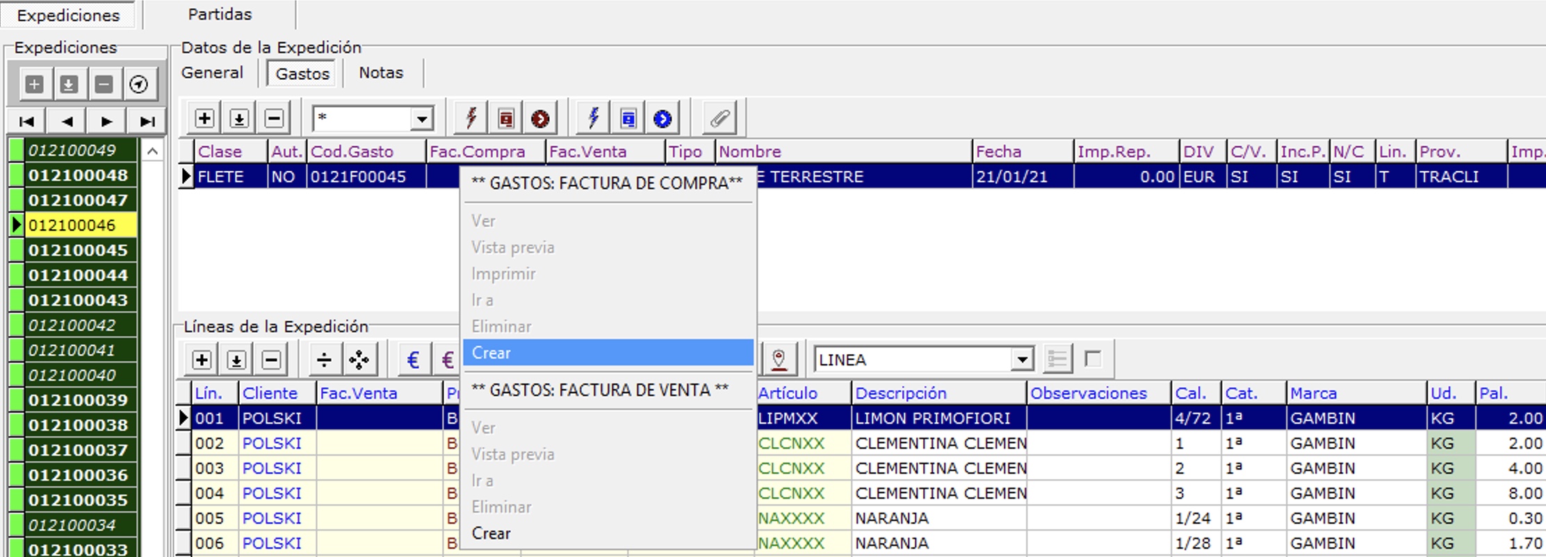 Desde la expedición: cuando un gasto se corresponde con una factura de compra, basta seleccionar el gasto, y pulsar el botón que se muestra para que se cree la factura de compra.