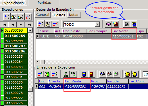 Como se ha vista en la pregunta anterior se puede facturar al cliente la mercancía y los gastos en la misma factura. Esta acción se puede realizar directamente desde la expedición usando el botón que se indica. Para hacer esto siga estos pasos: