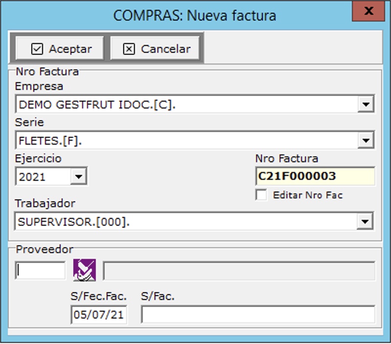 Estas facturas se suelen registrar directamente en la contabilidad, ya que no se reflejan en el resultado de la expedición por ser un gasto general, sin embargo es posible registrarlas en GestFrut para llevar la cartera de cobros y hacer los enlaces contables automáticamente.