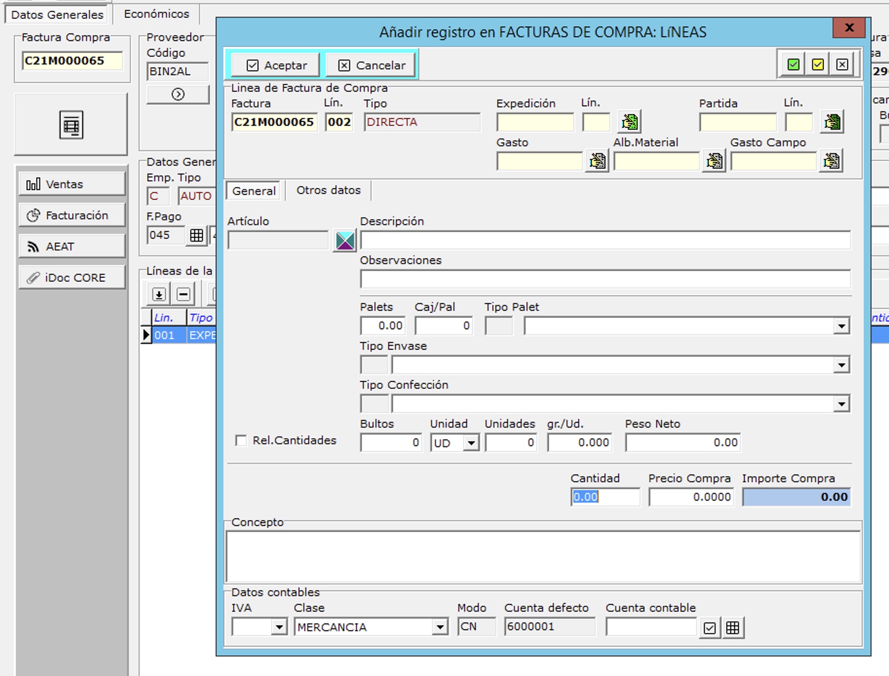 A continuación en la zona de las líneas debe usar el botón añadir línea directa y seleccionar un artículo de gastos, indicar la cantidad, el precio y la cuenta contable. Estas líneas no se deben repercutir a ninguna expedición pues son gastos generales.