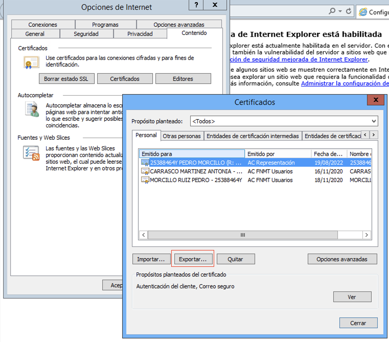 Una vez instalador en el Internet Exlorer podemos exportar el certificado a un archivo externo con extensión .PFX, para exportarlo use la opción : Opciones de Internet - Contenido y use el botón Exportar.