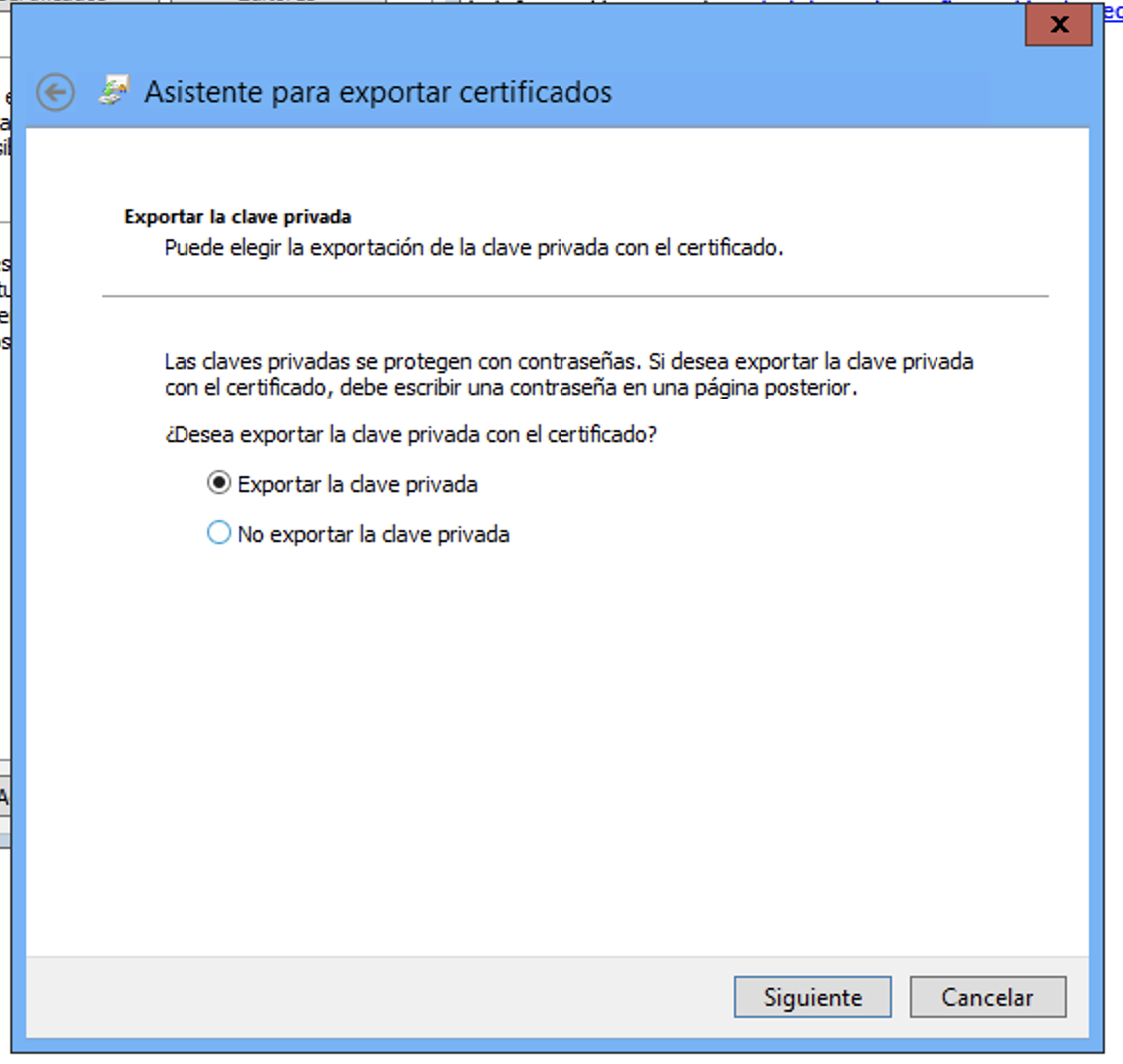 Hay que indicarle que se exporte el certificado con clave privada, esta clave se registra en el archivo PFX y será necesaria informarla en el GestFrut para poder utilizar el certificado.