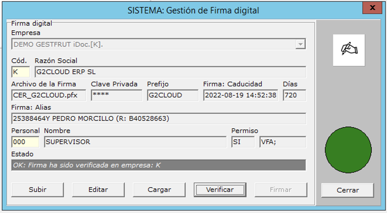 Usaremos el botón Subir para cargar en el GestFrut el archivo PFX y el botón Editar para indicar la contraseña y el prefijo de los documentos firmados. Si la clave es correcta se mostrara el alias y la fecha de caducidad del certificado. A partir de ese momento estará disponible para ser usado por los usuarios autorizados en la firma de cualquier tipo de documento PDF.