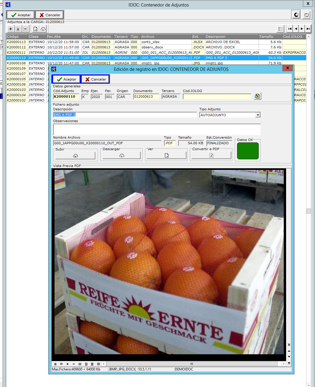 Los documentos que se archivan en la gestión documental iDoc CORE se asocian a las cargas, partidas, expediciones, facturas, remesas, etc. Esto permite consultar el documento directamente desde Gestfrut y evita tener que imprimirlos y archivarlos físicamente. Además, el documento que se archiva puede ser firmado digitalmente por lo que sustituye legalmente a la copia en papel.
