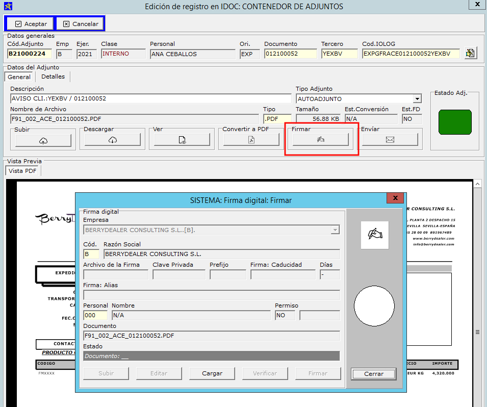 Los documentos archivados en formato PDF pueden ser firmados con su firma digital, para conocer como subir y configurar su firma digital lea este enlace: Firma Digital. Los documentos firmados digitalmente sustituyen al papel físico legalmente. Puede descargar o enviar el PDF firmado directamente desde esta pantalla.