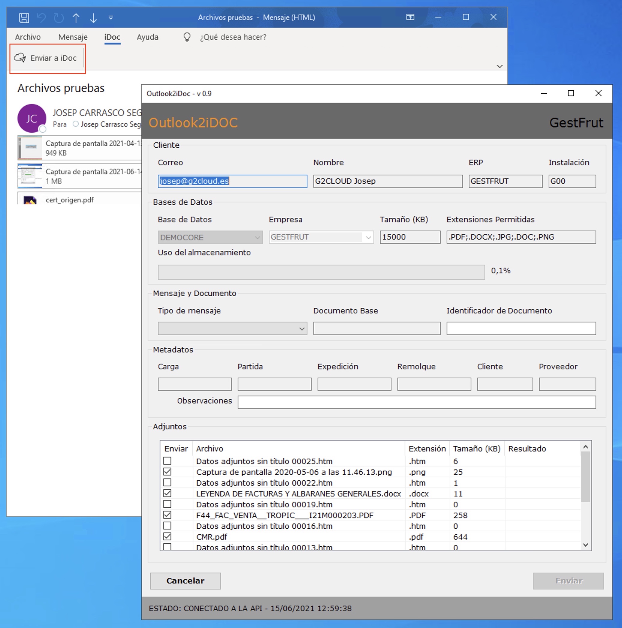 Se dispone de un complemento para Outlook que permite abrir un correo electrónico con adjuntos para poder archivarlo en iDoc CORE directamente contra la carga o expedición. Una vez instalado este complemento se mostrará un botón ‘Enviar a iDoc’ el cual permite identificar el tipo de mensaje y el documento (carga, partida, expedición, etc).