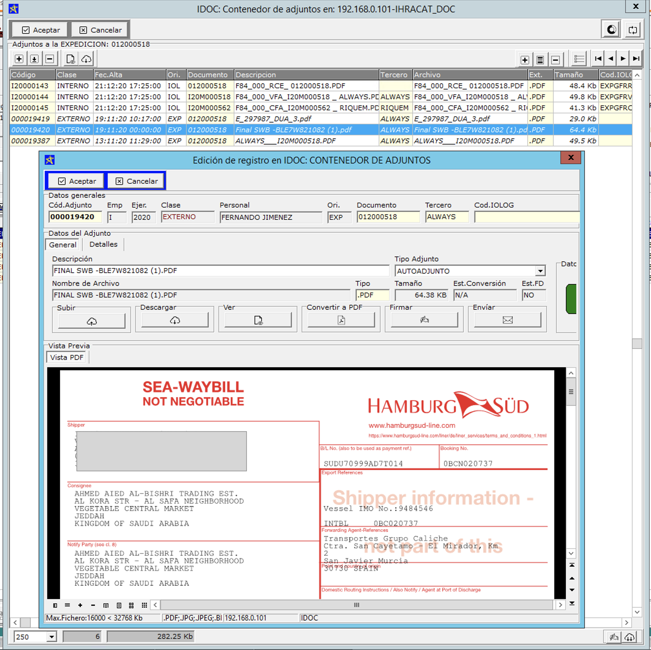 Todos los documentos relacionados con las cargas y expediciones pueden ser archivados en la gestión documental iDoc CORE, con el objetivo de eliminar el papel físico y de acceder directamente a los documentos relacionados con las expediciones.