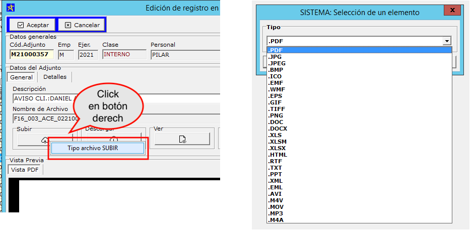 Si desea subir un archivo que no sea de tipo .PDF deberá usar el botón derecho del ratón cuando esté situado encima del botón de subir.