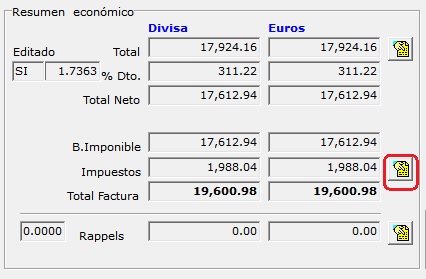 Los impuestos del documento se pueden consultar en el botón impuestos del grupo resumen económico en cada factura de venta o factura de compra.